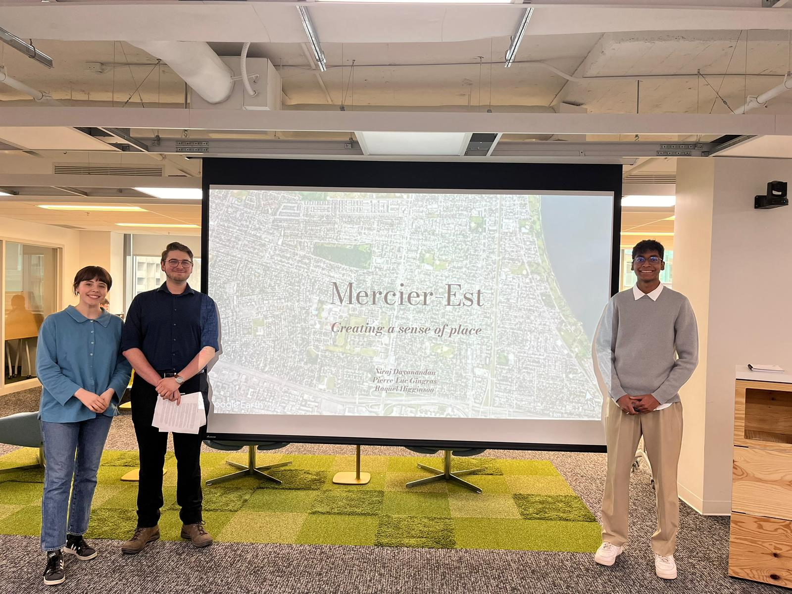 The final presentation to community members, planning professionals, and faculty (Pictured from left to right: Raquel Higginson, Pierre-Luc Gingras, Niraj Dayanandan, April 2024)